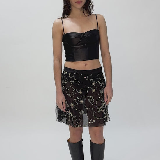 Falda mini bordada con dos capas de tull. Tull interior liso y tull visible bordado con diseño exclusivo galaxy. Cintura con cierre invisible.